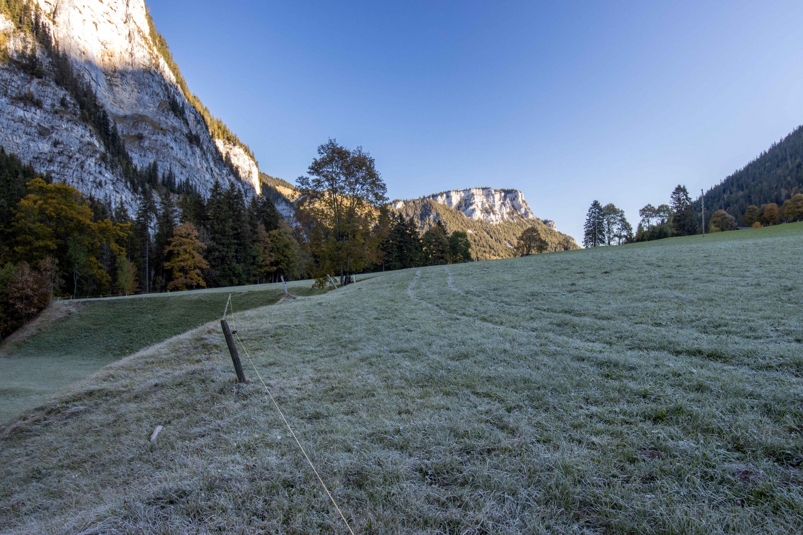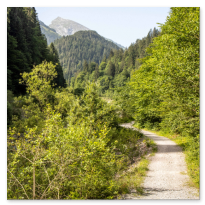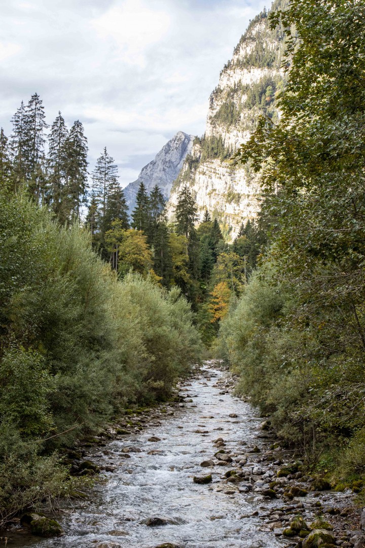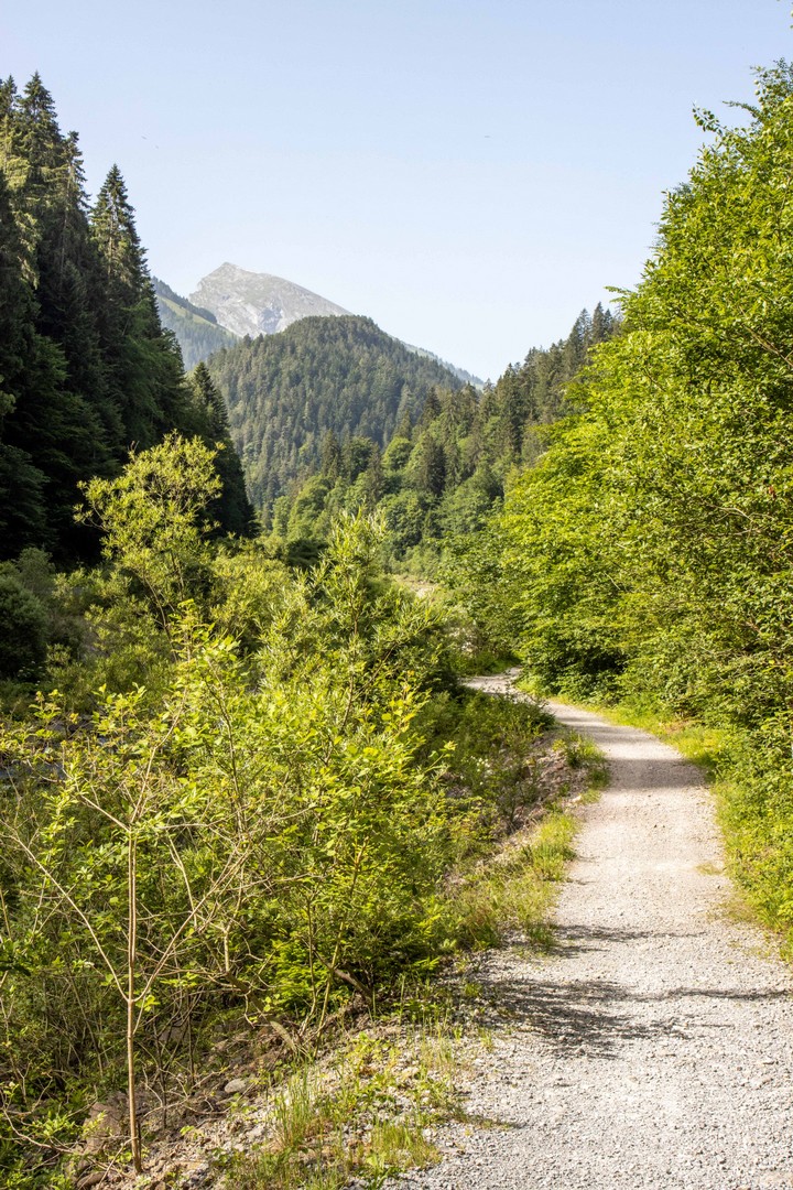 Eingangs wird das Diemtigtal auf der linken Flussseite durch einen schönen Wanderweg erschlossen. Die Strasse gegenüber verschwindet hinter Gebüsch und dem Rausen des Baches.