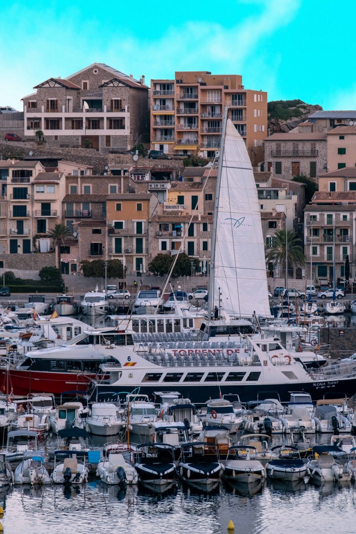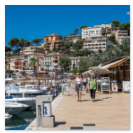 The bay of Port de Soller basically has three parts: western part with ships at their moored buoy, northeastern part at the old town with its old fisher boats and in the middle the noble part with motor and sailing yachts. There are some rich men who can spend a lot of money for yachting, buying or renting.