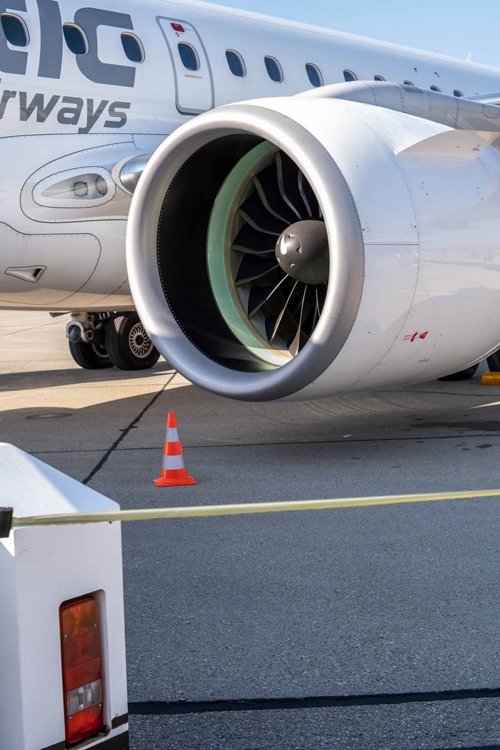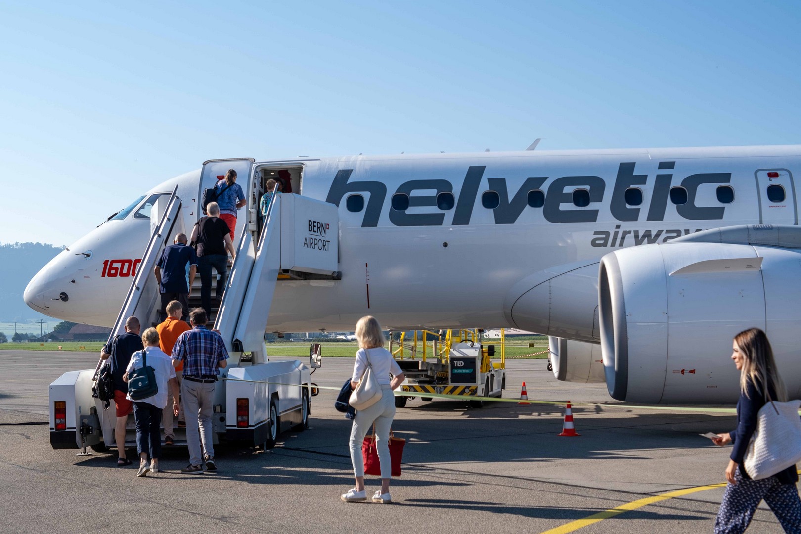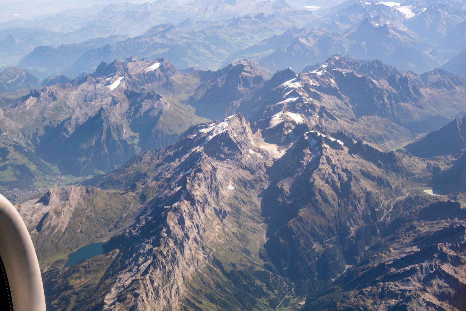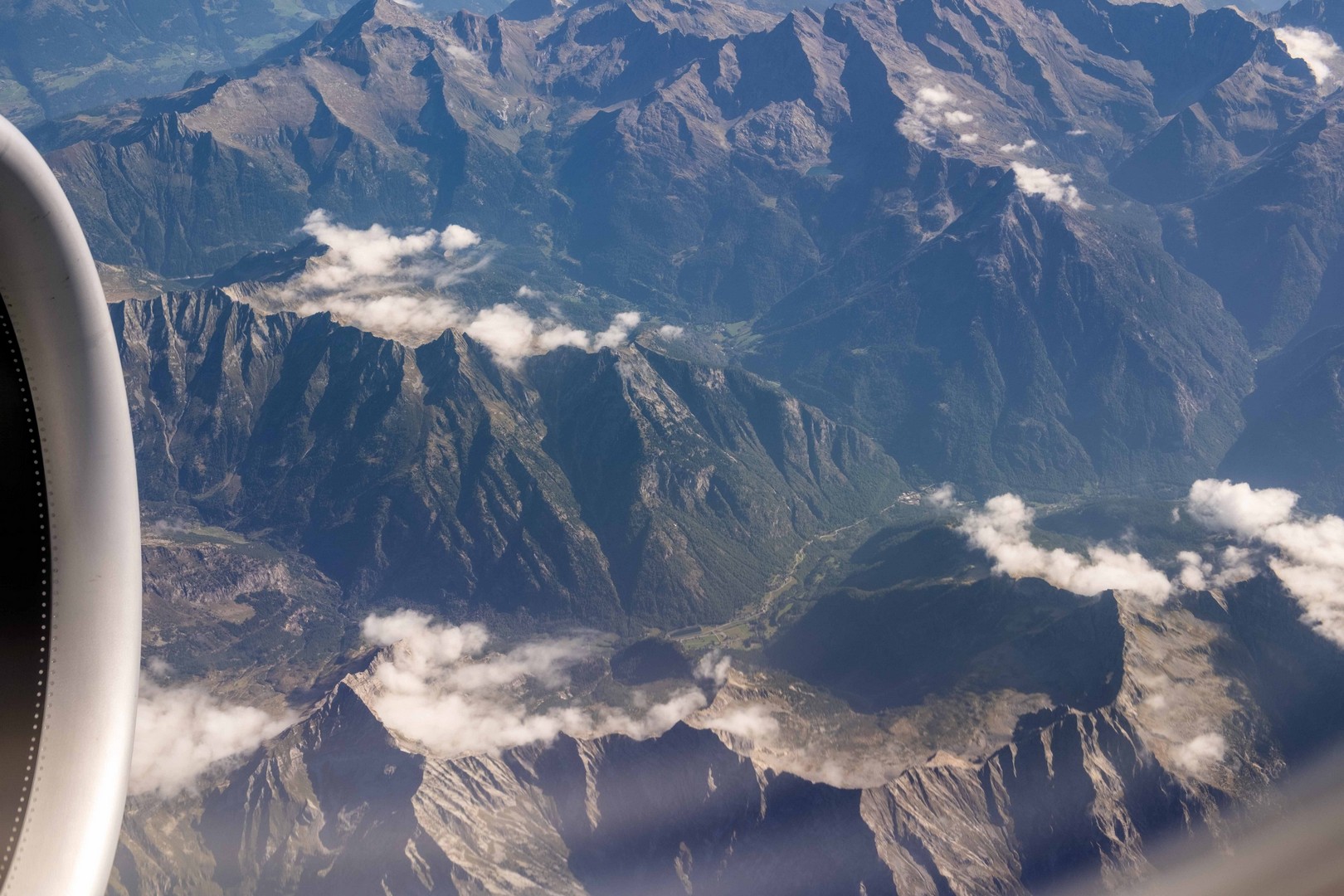 Our airplane, an Embraer of the Helvetic fleet, is ready for boarding. For a tourist shuttle it’s a very comfortable plane. Soon we are in the sky, read comments inside slide show.