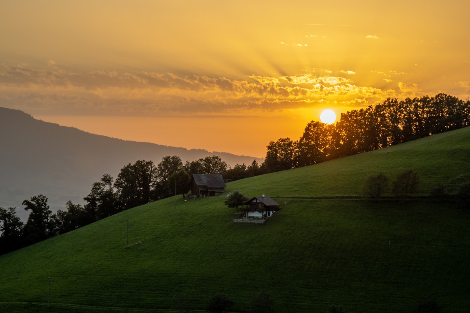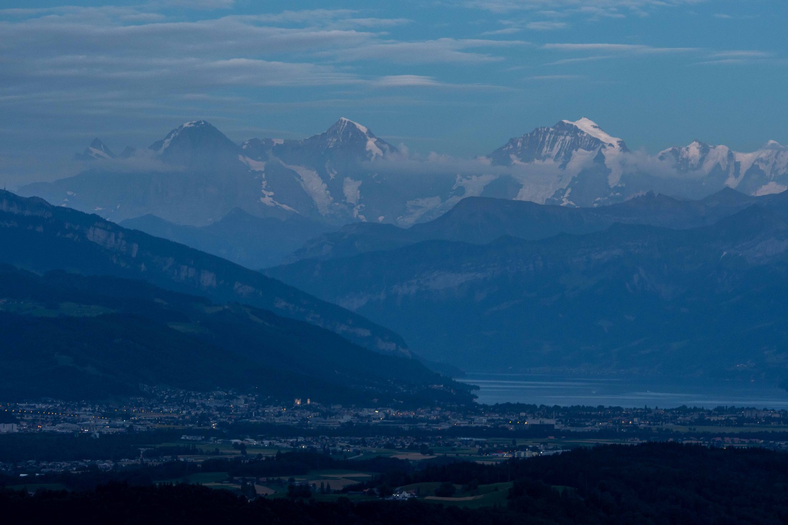 Wenn die Sonne sich dem Horizont nähert und schliesslich dahinter verschwindet, kann sich kaum jemand der Faszination des Lichtwechsels entziehen. Die Berge werden zuerst intensiv in den Rottönen angestrahlt, dann wird das Licht immer schwächer und schliesslich hat sich das Rot in ein Blau verändert.